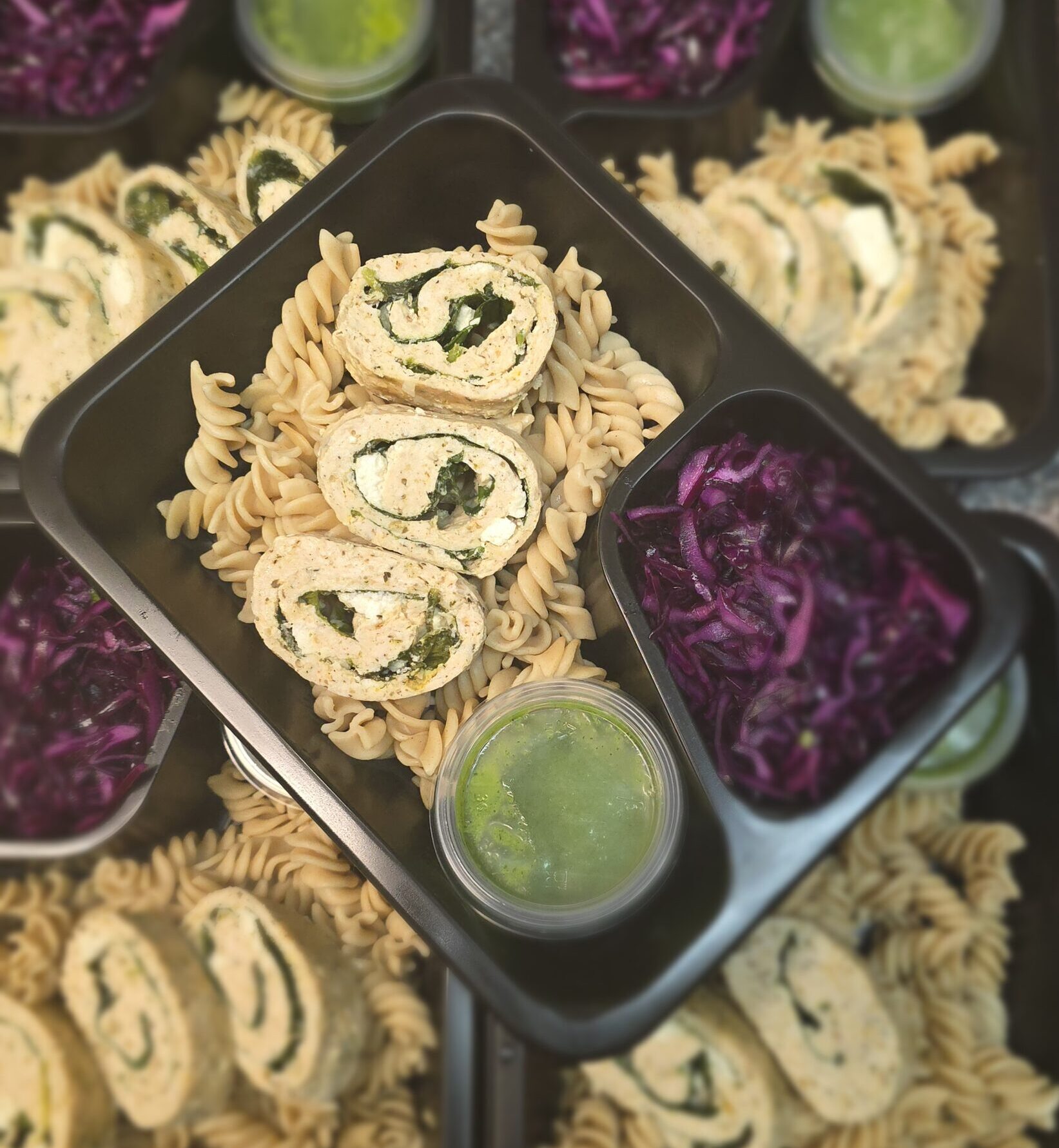 Roladka drobiowa z makaronem razowym, czerwoną kapustą z dipem koperkowym