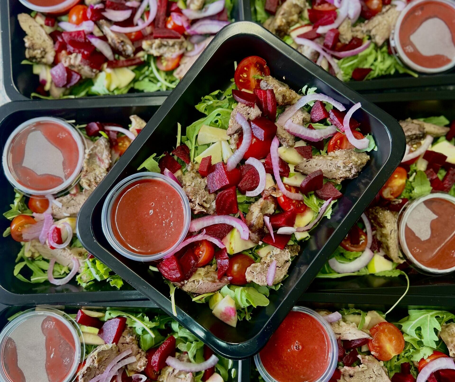 Sałatka z wątróbką, burakiem, pomidorkami, czerwoną cebulą z dipem malinowo-miodowym